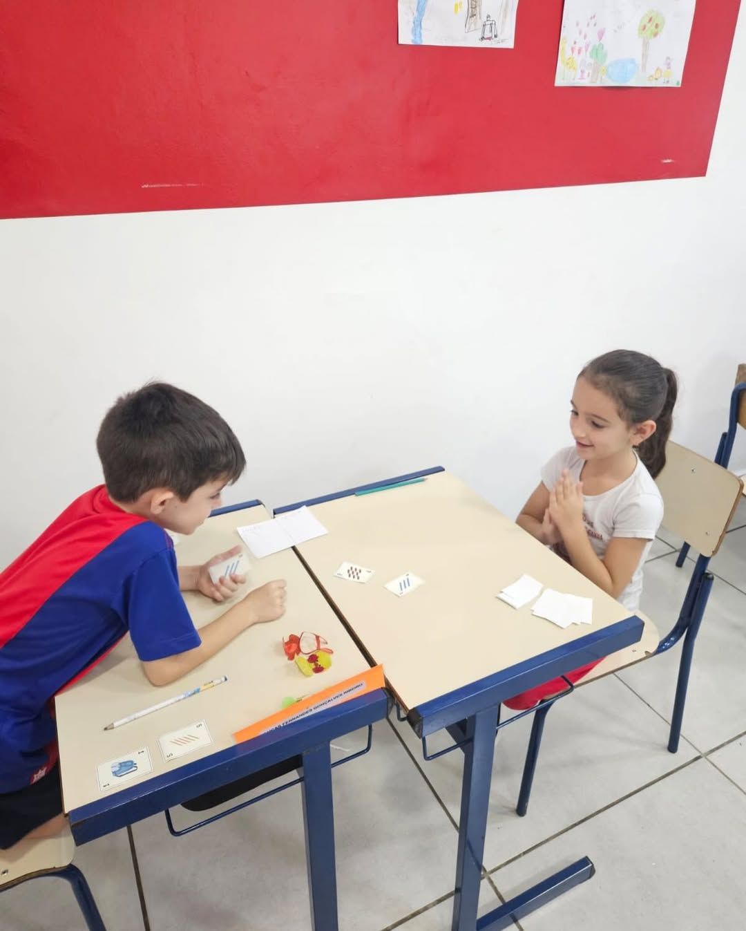 O desafio era alcançar primeiro cinco pontos. Enquanto jogavam, os alunos exercitavam o raciocínio lógico, observavam os números e registravam os resultados, transformando o aprendizado em uma experiência leve e divertida.