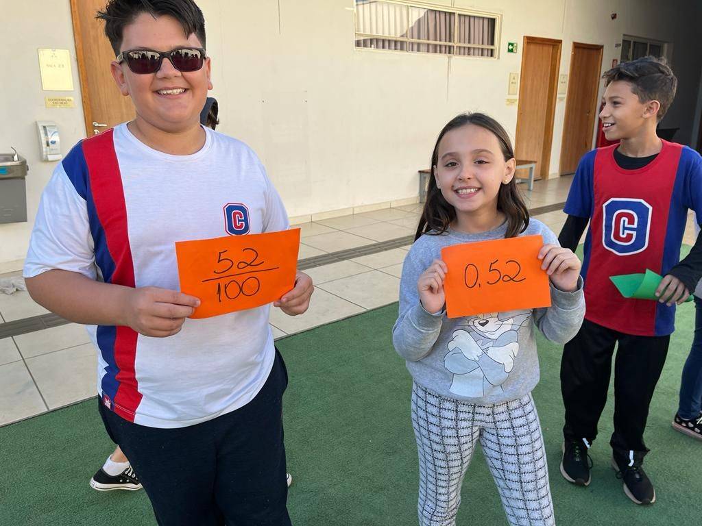 Nessa atividade, os alunos do 5º ano puderam compreender que as frações também podem ser representadas por números decimais!! Para isso, metade da turminha pegou cartões com frações e a outra metade cartões com números decimais… moveram se pelo parque e depois tiveram que encontrar o seu par.