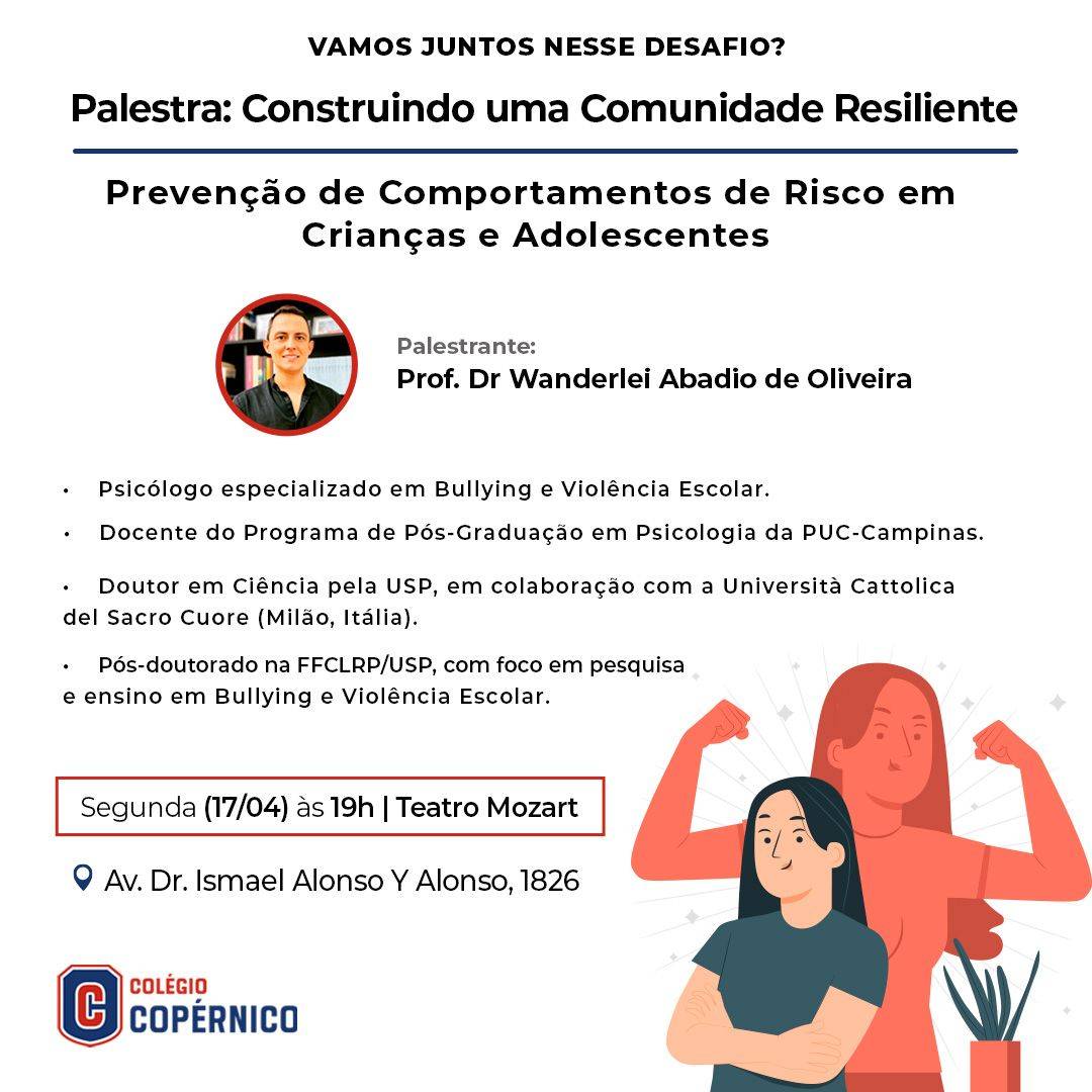 Ontem, dia 17/4, todos os pais e responsáveis foram convidados para participarem da nossa palestra "Construindo uma Comunidade Resiliente: Prevenção de Comportamentos de Risco em Crianças e Adolescentes", ministrada pelo Prof. Dr Wanderlei Abadio de Oliveira, psicólogo especializado em Bullying e Violência Escolar.