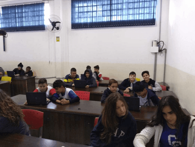 Os alunos do 7º ano em treinamento sobre o uso da Plataforma de ensino Eleva. Com o uso dessa Plataforma o estudo vai além da sala de aula, proporcionando aos alunos um ensino individualizado através de resolução de exercícios e vídeo aula onde permite o avanço na aprendizagem.