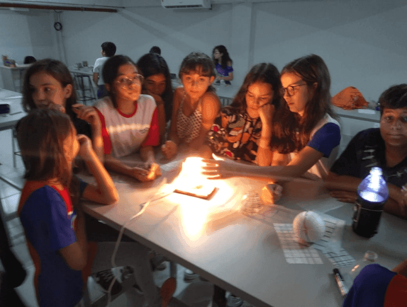 Os alunos do 6° ano A e B, aprenderam sobre as projeções cartográficas cilíndrica, cônica e azimutal em aula prática no espaço maker com Professora de geografia, Tamiris S. P. Cardoso.