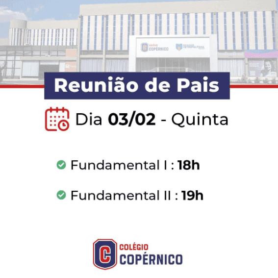 O Colégio Copérnico convida a todos os pais e/ou responsáveis de alunos, para participarem da reunião que acontecerá dia 03/02, a partir das 18h, para turmas do Fundamental 1 e 2.
